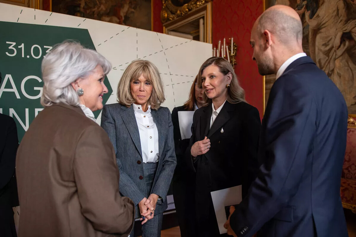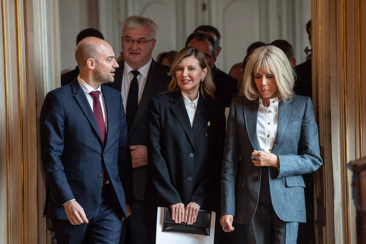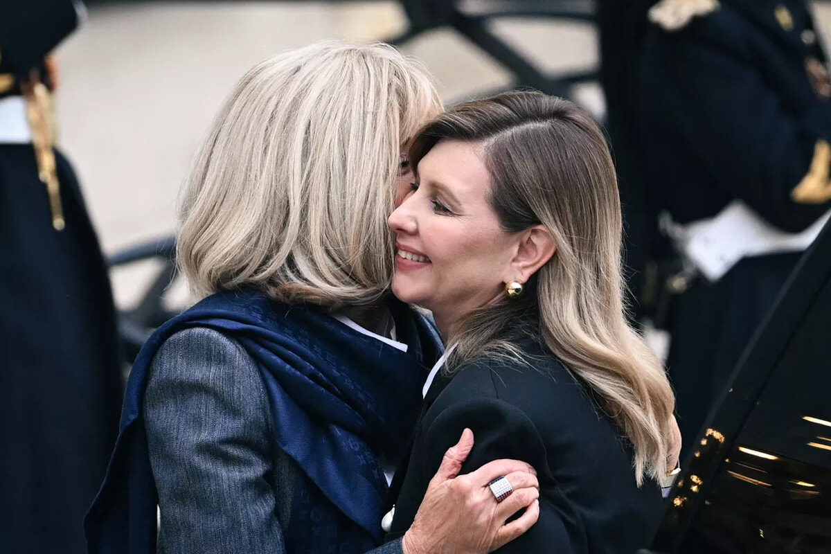 2人のファーストレディはこの日、共にダークカラーのパンツスーツで登場した。12月1日、ブリジット・マクロンとエマニュエル・マクロンは、ウクライナの「和平案」について話し合うため、ヴォロディミル・ゼレンスキー大統領夫妻を大統領官邸のエリゼ宮に迎えた。フランスのファーストレディは、エリゼ宮の中庭でウクライナのファーストレディに出会うと笑顔で抱きしめた。