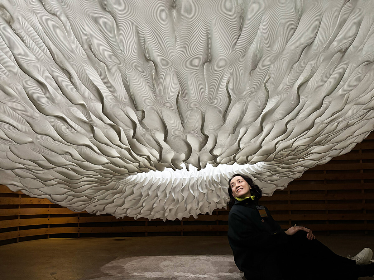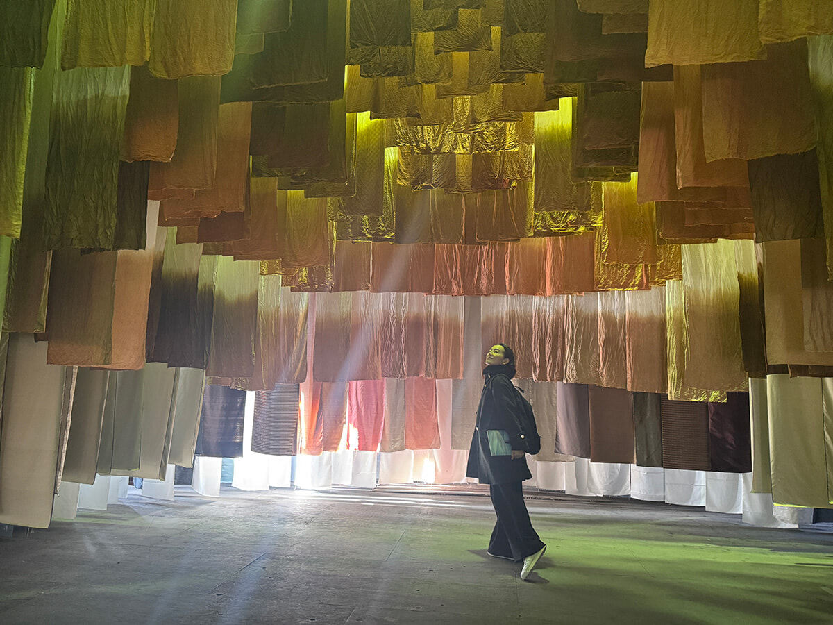 「⽬に⾒える織り⽬の下には、無数の⾒えない⼒が⾛っている。それは、まるで地下を流れる伏流⽔のように、⾳や⼿のリズム、記憶、⼟地の気配が、織物の下層で脈打っているのです」。ハッとする素敵な視点ですよね。このテーマにアーティストたちが呼応し空間そのものが喜んでいるように感じるのです。