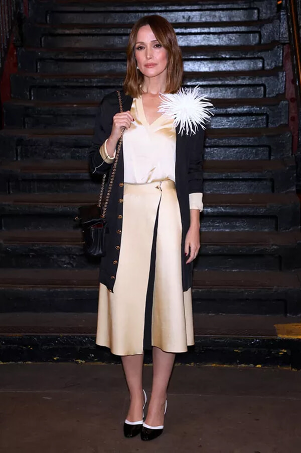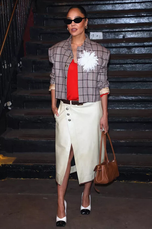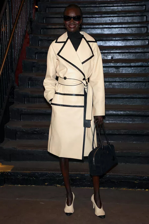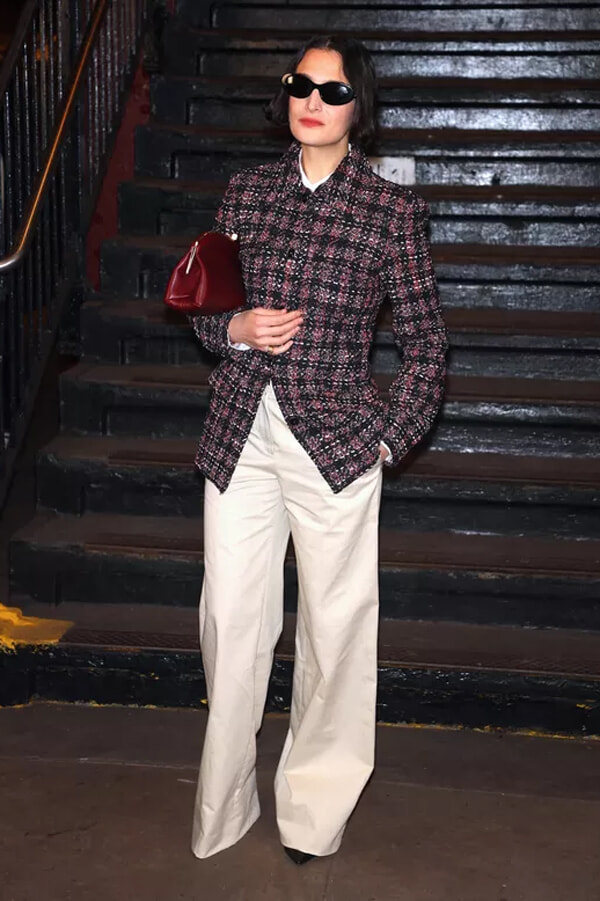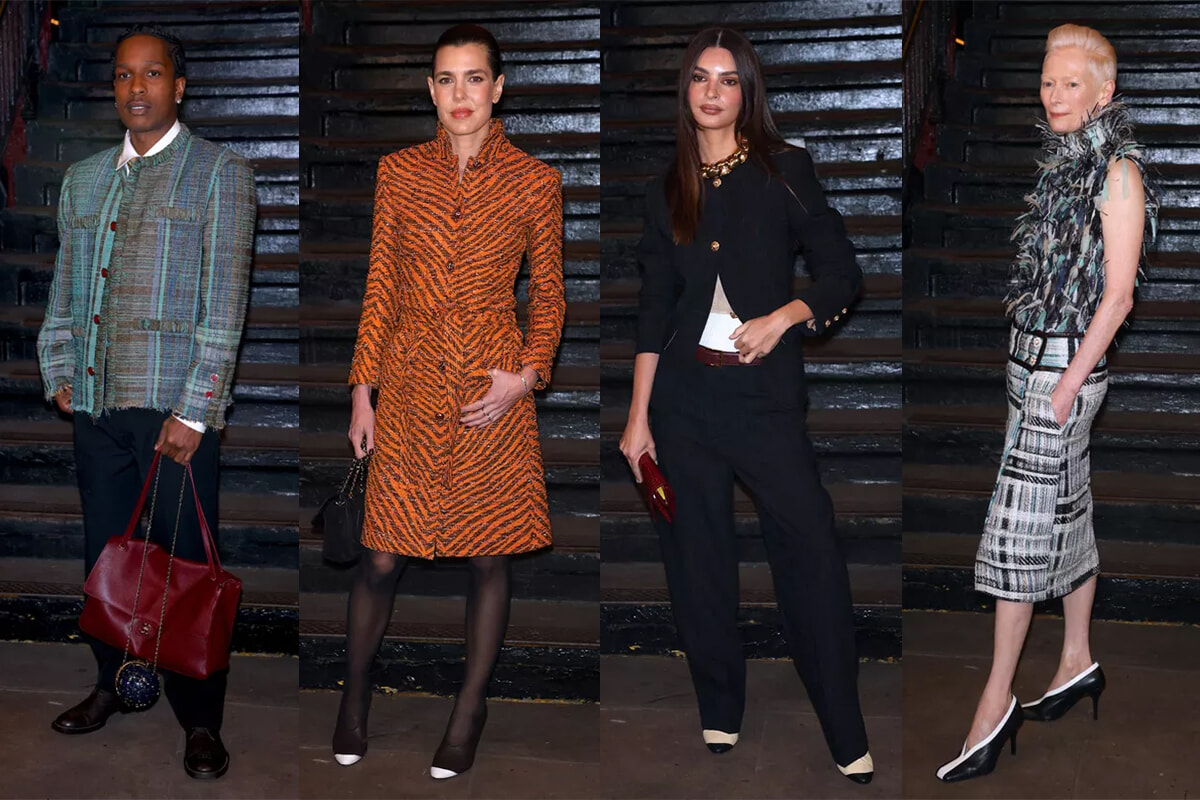 その夜、同駅のプラットフォームはニューヨークで最高におしゃれな場所となった。ティルダ・スウィントンは、2026年春夏コレクションのルック57、ツイードとフェザーのアンサンブルで注目を集めた。一方、クリステン・スチュワートは黒のセットアップで登場、歌手アンジェルも同じく黒のバックレスドレスを着て現れた。最前列に座るゲストの中で、シャルロット・カシラギはカラフルな服を着ていた数少ないひとりで、ゼブラ柄プリントでスパンコールツイードのハニーカラーコートドレスを着用していた。