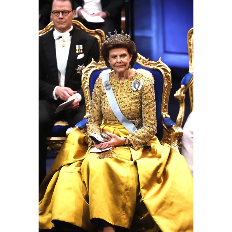 シルヴィア王妃は、上半身にカラフルなクリスタルがあしらわれた黄土色のロングドレスをまとい、スウェーデン王室の中でも特に大きく伝統的なティアラを身につけていた。このティアラは「ナイン・プロング・ティアラ(9本の枝のティアラ)」として知られ、1860年代に制作され、元々は1872年から1907年に崩御するまでスウェーデンを統治したオスカル2世の妻、ドイツ生まれのソフィア王妃が所有していた。ティアラには580個以上の宝石が使われており、9本の尖った部分には大きなダイヤモンドが輝き、さらに3本には小さなダイヤモンドが配置されている。中央のデザインには大きなダイヤを金属のアーチで囲んだモチーフがあり、日の出や日の入りを表しているといわれている。