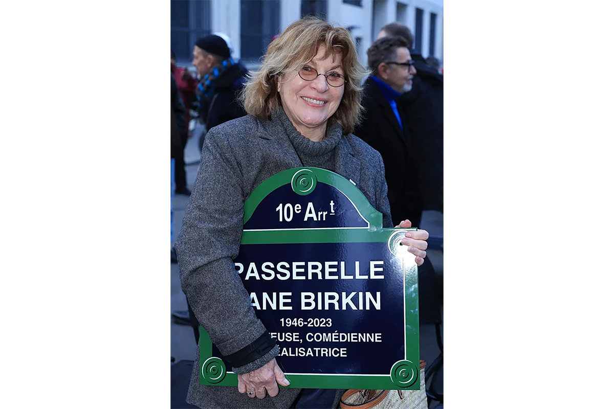 その後、ルー・ドワイヨンとシャルロット・ゲンズブールは、歩道橋の上部に設置される2枚の銘板を披露した。そこには、今後この橋を行き交う人々が目にすることになる「ジェーン・バーキン歩道橋(1946-2023)― 歌手、女優、映画監督」という文字が刻まれている。
