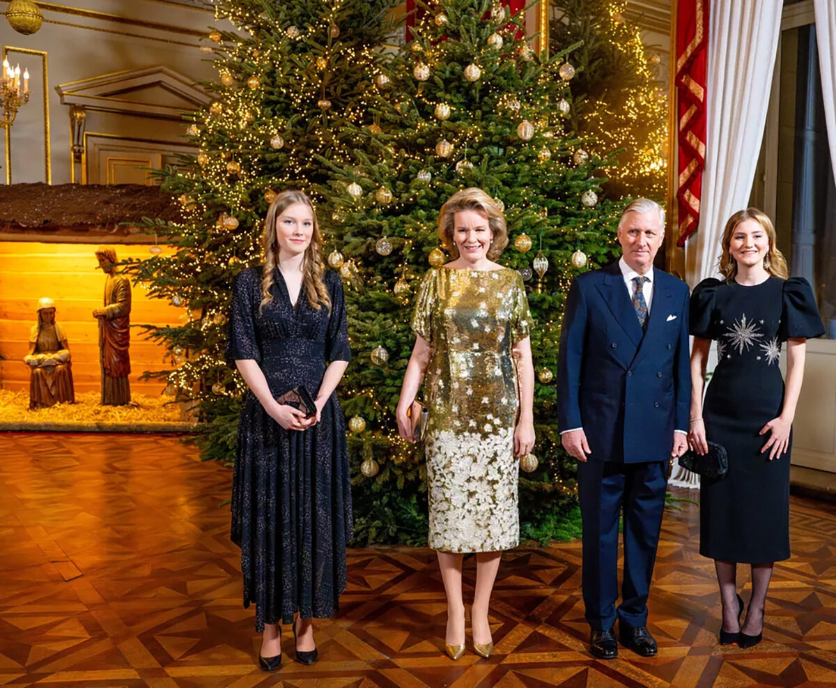 ブリュッセル王宮で、この季節のハイライトとなる恒例のクリスマスコンサートの収録が行われた。この夜は、一年を通じて王室を支え、公式行事の円滑な運営に貢献した500人以上の市民を称える場であった。フィリップ国王と並んで、マチルド王妃は、娘のエリザベート王女とエレオノール王女に囲まれ、特別に飾られた壮麗なクリスマスツリーの前で記念撮影を行った。3人とも、祝祭の雰囲気にぴったりの華やかな装いで輝いていたが、特に長女のエリザベート王女はその存在感が際立っており、会場の人々の視線を一身に集めた。