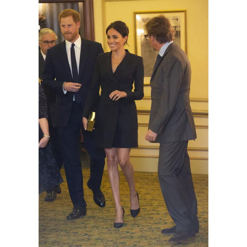 ミュージカル「ハミルトン」のガラ公演に出席する前、ロンドンのヴィクトリア・パレス・シアターに到着したメーガン夫人(ロンドン、2018年8月29日)