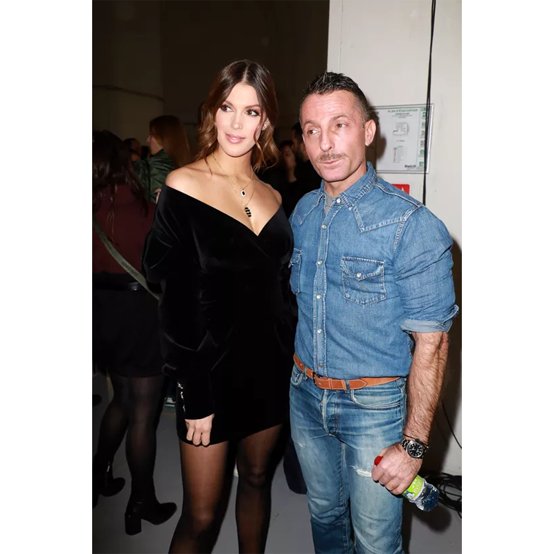 パリ・ファッションウィーク期間中、アレクサンドル・ヴォーティエの2029年春夏コレクションのショーを前に、バックステージでデザイナー本人とともにポーズをとるイリス・ミッテネール。(フランス、2019年1月22日)