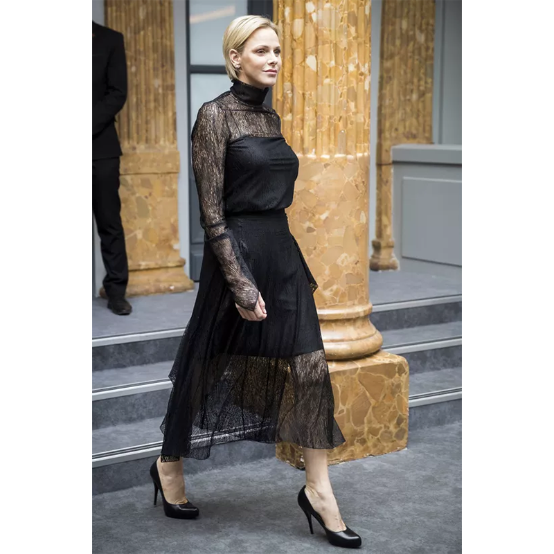 パリ・ファッションウィーク2019年春夏コレクション期間中、アクリスのショーを前にバックステージに到着したモナコ公国のシャルレーヌ公妃。(パリ、2018年9月30日)