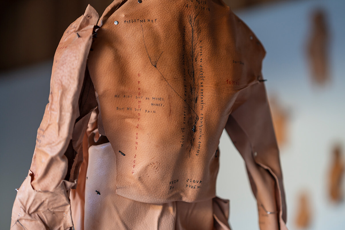 「豚革は人間の皮膚に最も似ているといわれ、彫り師がタトゥーの練習に使うほどです。この作品は、フェンクルさんが自身の身体に彫ったタトゥーをそのまま投影しています」