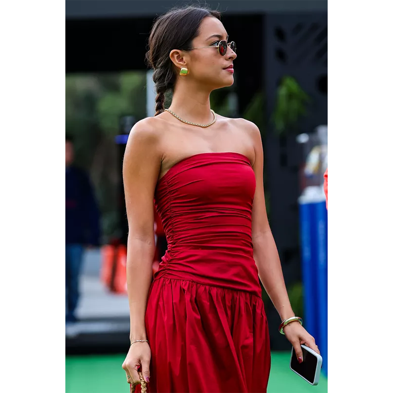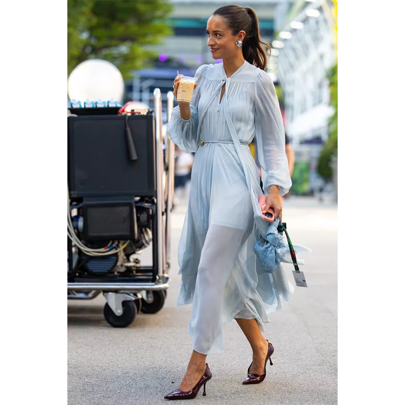 今年、グレース・ケリーに捧げられたオマージュの中でも、最も美しく、少なくとも最もエレガントだったと言えるかもしれない。7月12日、第76回赤十字ガラがモナコで開催された。この人道支援団体のためのチャリティイベントには、シャルレーヌ公妃やカミーユ・ゴットリーブも出席し、アレクサンドラ・サン・ムルーは再び注目を集めた。ルーヴル美術館附属校「エコール・デュ・ルーヴル」の元学生である彼女は、アイスブルーのシフォン素材で仕立てた壮麗なドレスに身を包み、ひときわ輝きを放っていた。ドレスは、ドレープの効いたビスチェに細いストラップ、軽やかに広がるスカート、そして左肩にあしらわれたシースルーのマキシスカーフが特徴的だった。