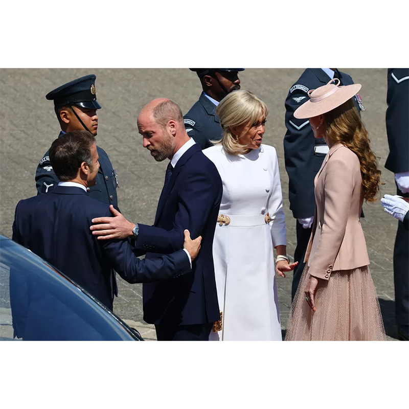 ウィリアム皇太子とキャサリン皇太子妃は、英国公式訪問のために来英したエマニュエル・マクロン仏大統領と妻のブリジット・マクロンを、ノースホルト空軍基地で出迎えた。(ノースホルト、2025年7月8日)