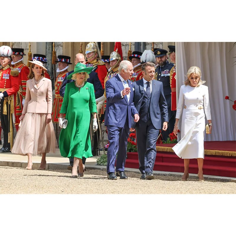 キャサリン皇太子妃、カミラ王妃、チャールズ3世、エマニュエル・マクロン仏大統領、ブリジット・マクロンは、ウィンザー城で行われたフランス大統領夫妻の歓迎式典にそろって出席した。(ウィンザー、2025年7月8日)