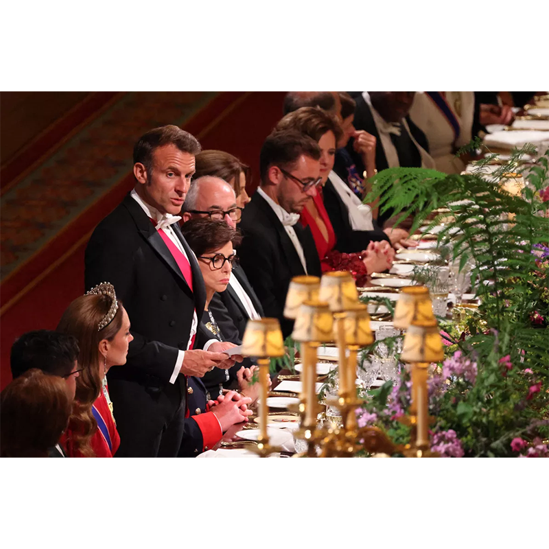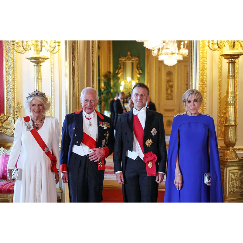 カミラ王妃とチャールズ3世は、ウィンザー城で行われた盛大な国賓晩餐会に、エマニュエル・マクロン大統領とブリジット・マクロンを招待した。(ウィンザー、2025年7月8日)