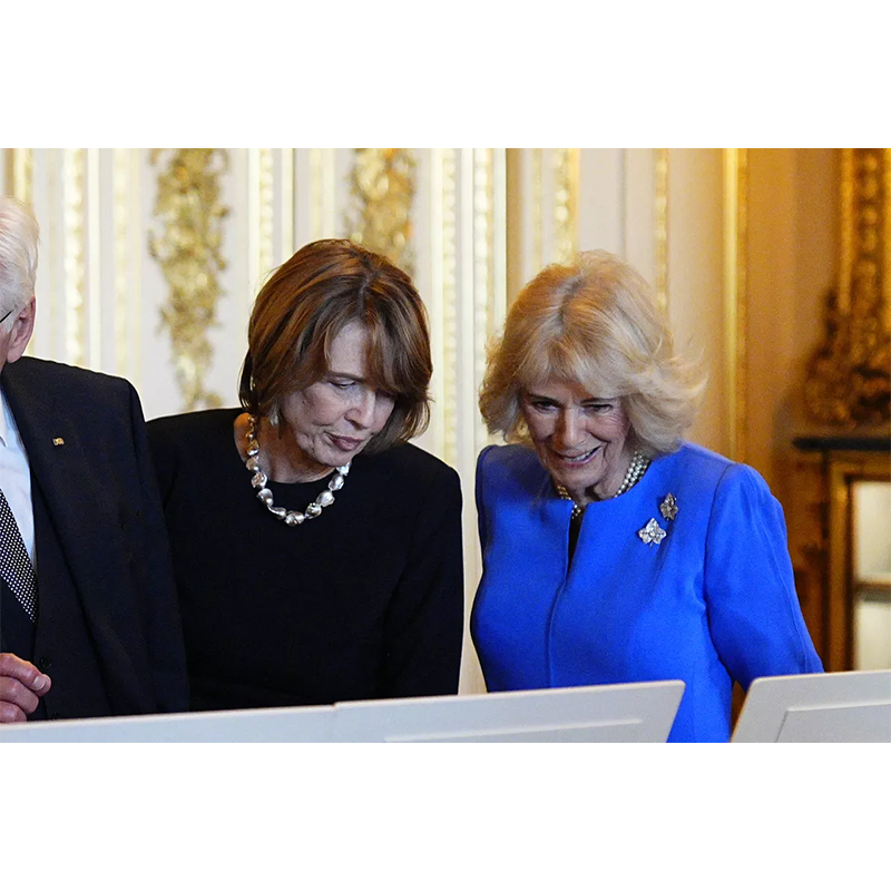カミラ王妃とエルケ・ビューデンベンダーは、ウィンザー城の訪問中に言葉を交わした。(ウィンザー、2025年12月3日)