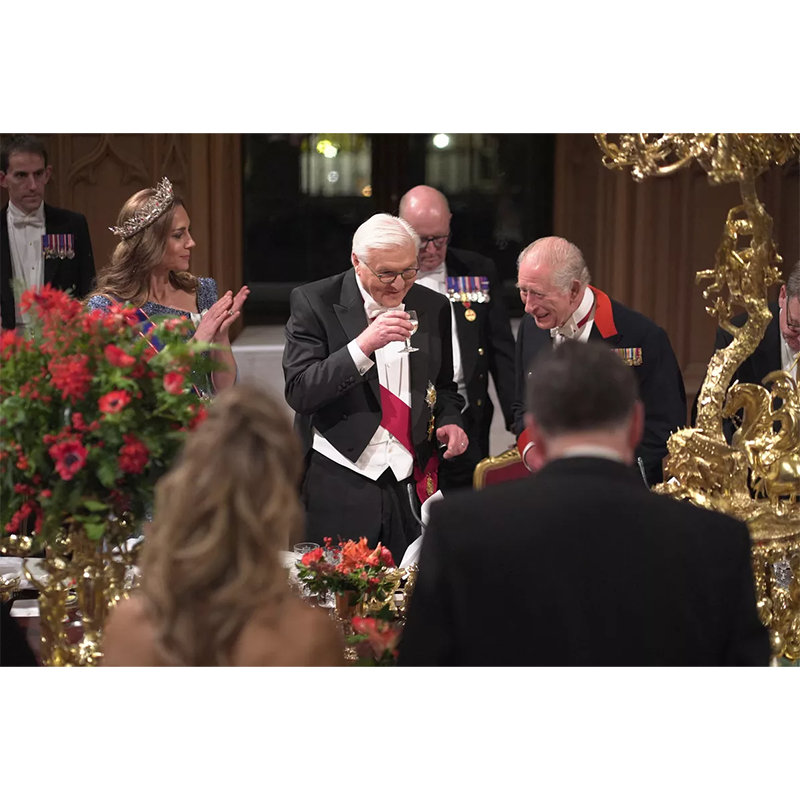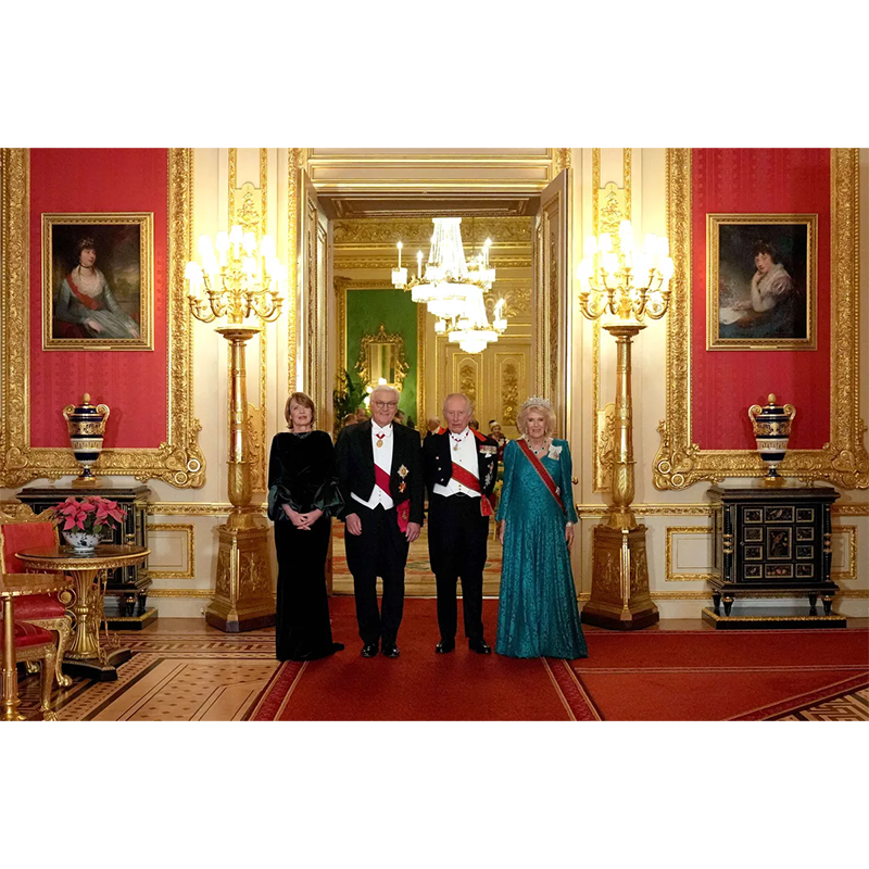 チャールズ3世とカミラ王妃は、ドイツのフランク=ヴァルター・シュタインマイヤー大統領と妻エルケ・ビューデンベンダーを、ウィンザー城で行われた盛大な国賓晩餐会に招待した。(ウィンザー、2025年12月3日)