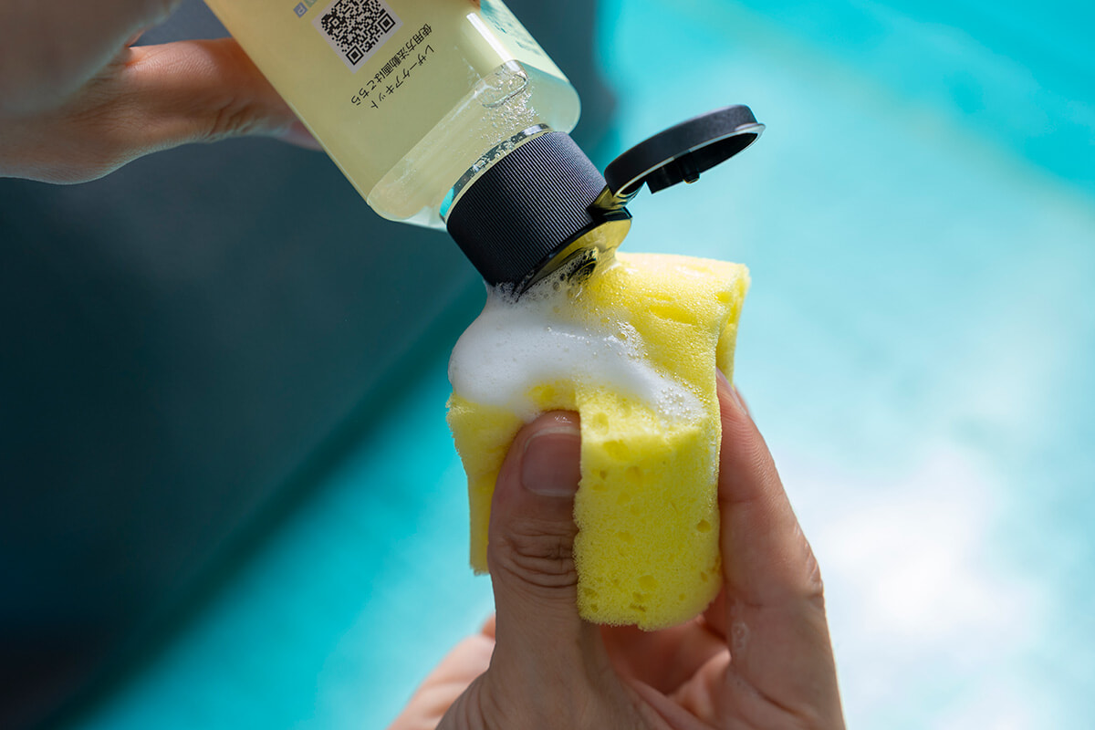 雨ジミや日常の頑固な汚れを取り除くには、革専用のクリーナーが有効。クリーナーを手のひらサイズの柔らかいスポンジ(メラミンスポンジは不可)に染み込ませ、泡が十分に出るまでスポンジをよくもむ。