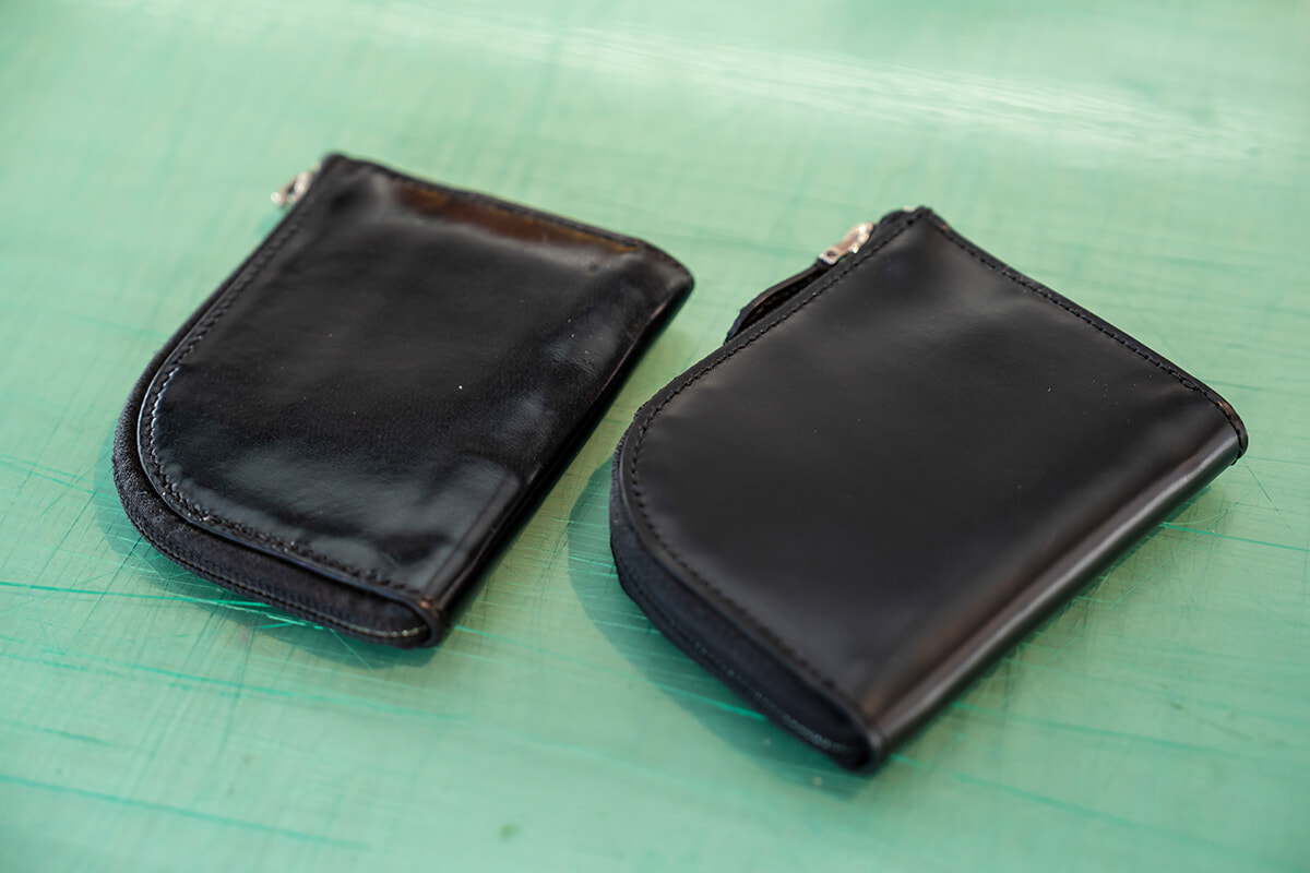 味わい深くエイジングされた革財布の一例。新品(右)は硬くマットな質感だが、約10年使用後(左)は、革が柔らかくなりツヤが出ている。色あせなどもなく、良い状態。中に入れているカードなどの形が浮き出し、個性になる。(ユニタスファーイーストの革製品ブランド「ichisanroku Japan」のアイテムのエイジング例)