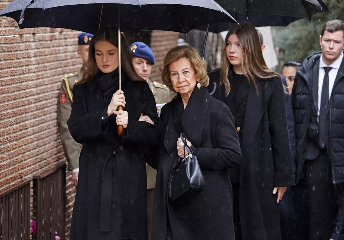 一方、次女のソフィア王女はリスボンのフォワード・カレッジで学んでいる。雨が降るなかで黒い傘を差したソフィア前王妃がレオノール王女に腕を支えられ、大聖堂へ向かった。すぐ後ろをソフィア王女が続く。フェリペ6世国王とレティシア王妃はすでに入場していた。ミサの間、ソフィア前王妃は最前列に座り、孫娘や息子夫妻に囲まれていた。アラブ首長国連邦で暮らす前国王フアン・カルロス1世は、健康上の理由から来なかったと「ポワン・ド・ヴュ」誌は伝えている。