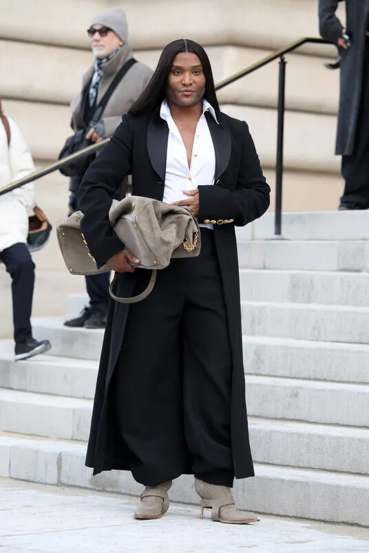 きらびやかな最前列。カーラ・ブルーニは、相変わらずエレガントで、ひときわ視線を集めていた。太ももまで大胆にスリットが入ったアシンメトリーなブラックドレスに身を包み、今季の注目アイテムであるレースタイツをチョイス。ゴールドボタンがあしらわれたロングのブラックコートと、オープントゥのパンプスを合わせていた。手元には、クリスタルをあしらった爪付きの彫刻的なゴールドハンドルが印象的なバッグを携え、スキャパレリらしいシュルレアリスムのエッセンスを添えていた。