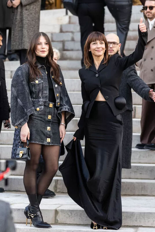 フランス映画界で最も人気のある女優ソフィー・マルソーは、長く流れるようなサテンのスカートと立体的なシルエットのジャケットを着こなし、一方、23歳の娘は、ミニスカートとゆったりとした袖のジャケットを合わせたグレーのデニムのアンサンブルを身に着けていた。