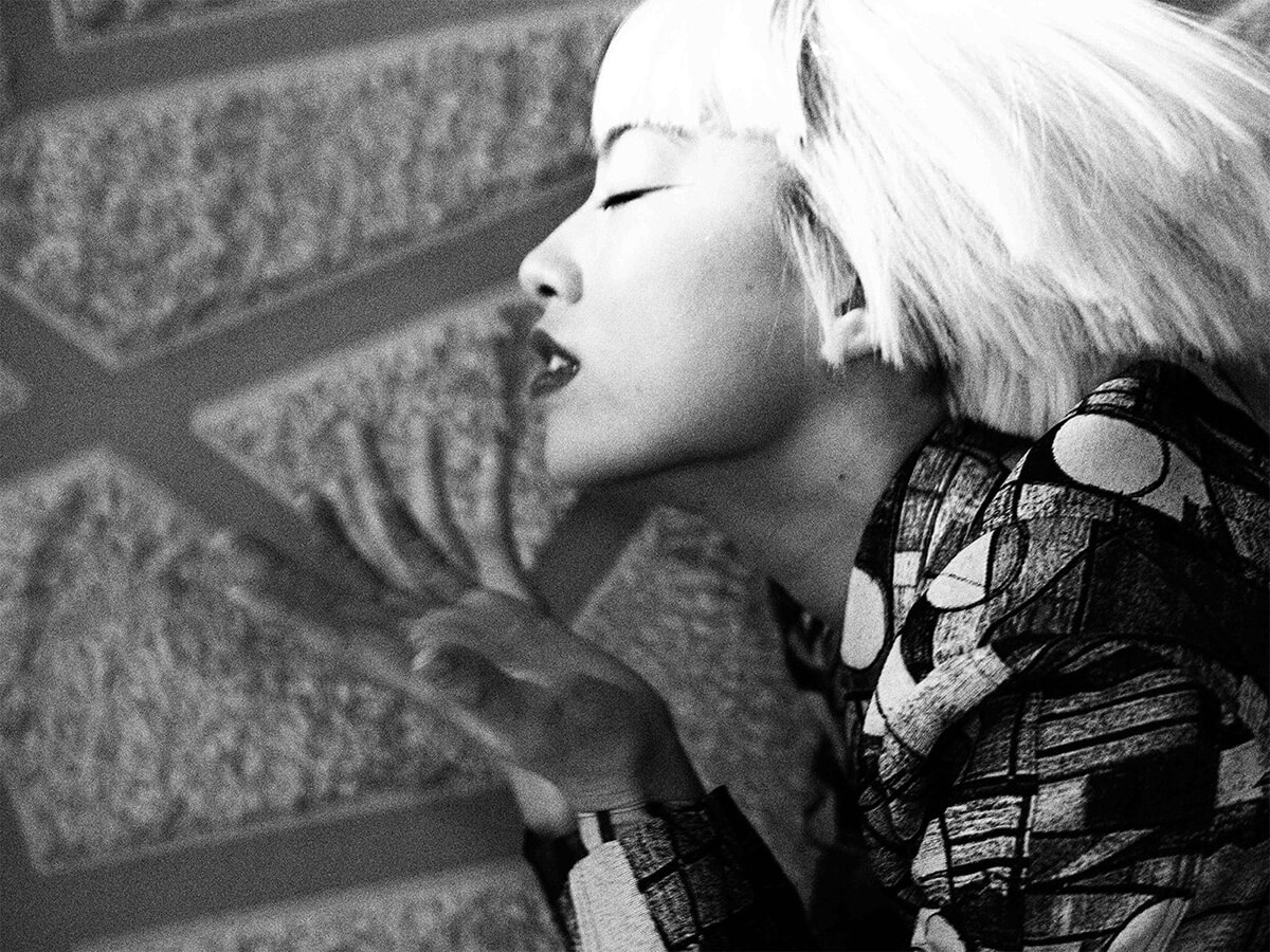 アオイヤマダのポートレートを見ていると、全身が写っていなくても彼女が躍っていることがわかる。顔の表情でもダンスしているように見える。すべての筋肉が、自由なマインドから繰り出されたようでありながら、計算されたように思い通りに「動いている」印象だ。だから、そこに魂や情感を見出すことができる。しどけない佇まいも、ダンスの一部。そして過剰なようでいてとても整えられたメイクアップの影や光や質感も、モノクロの写真の中に艶やかに映える。