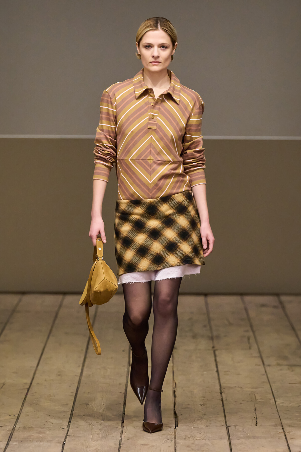 ランウェイに登場したルイーザ・ジェイコブソンは、暖色系のストライプポロシャツの袖をまくりあげ、タータンチェックのミニスカートの下から裾がほつれた白いアンダースカートを覗かせたスタイルを披露した。1970年代風ルックを完成させるのはストラップポインテッドヒールとスエードのハンドバッグだ。カジュアルに統一されたシルエットはメリル・ストリープの娘が普段から着ているスタイルに近い。