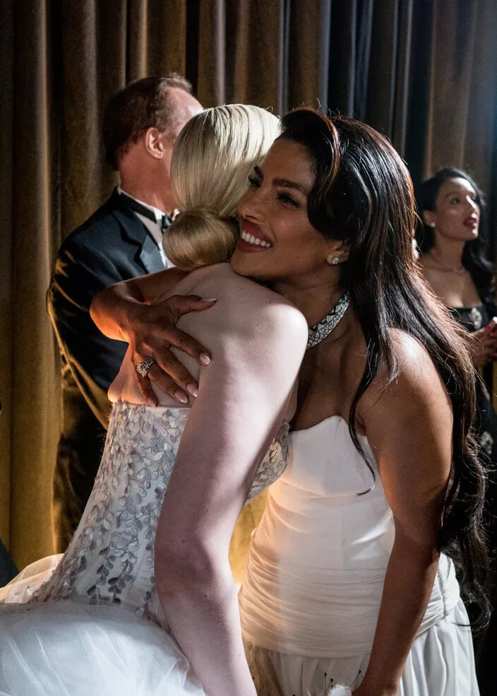 第98回アカデミー賞の舞台裏で抱き合うエル・ファニングとプリヤンカー・チョープラー。(ロサンゼルス、2026年3月15日)photography: John Shearer/98th Oscars / Getty Images The Academy via Get