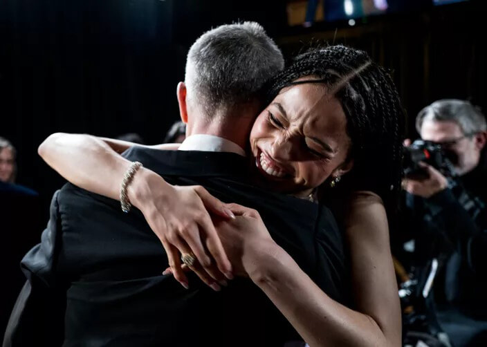オスカー像2つとハグ。主演男優賞の受賞者と主演女優賞の受賞者が出会った瞬間。(ロサンゼルス、2025年3月15日)photography: John Shearer/98th Oscars / Getty Images The Academy via Get