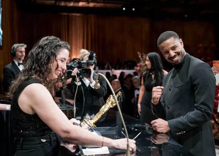 映画『罪人たち』で主演男優賞を受賞し、オスカー像に自分の名前を刻むことができることを誇らしげに見つめるマイケル・B・ジョーダン。(ロサンゼルス、2026年3月15日) photography: John Shearer/98th Oscars / Getty Images The Academy via Get
