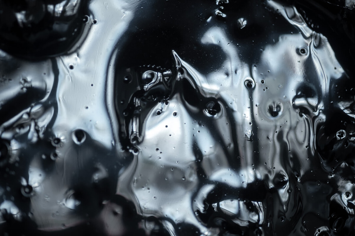 会場入口に掲げられたテキストは冥界の魅惑的なシステムを並べ、こっちへおいでと誘いかける。展示空間は死者のための”地下レイヴ”のクラブとして構成され、テクノミュージックの低音部だけを取り出した催眠的なサウンドに満たされている。視線を吸い込む濡れ羽色のオブジェは観る者を時間・未来・神話をめぐる思考へと誘う。これらの彫刻に使われた「瀝青(れきせい)」という漆黒の素材は、太古の生物が悠久の時を経て分解された石油由来の粘性の強い物質。古代では神聖なものとされ、ミイラの防腐処理にも使われたが、現代ではアスファルトなど実用的・工業的に用いられる。