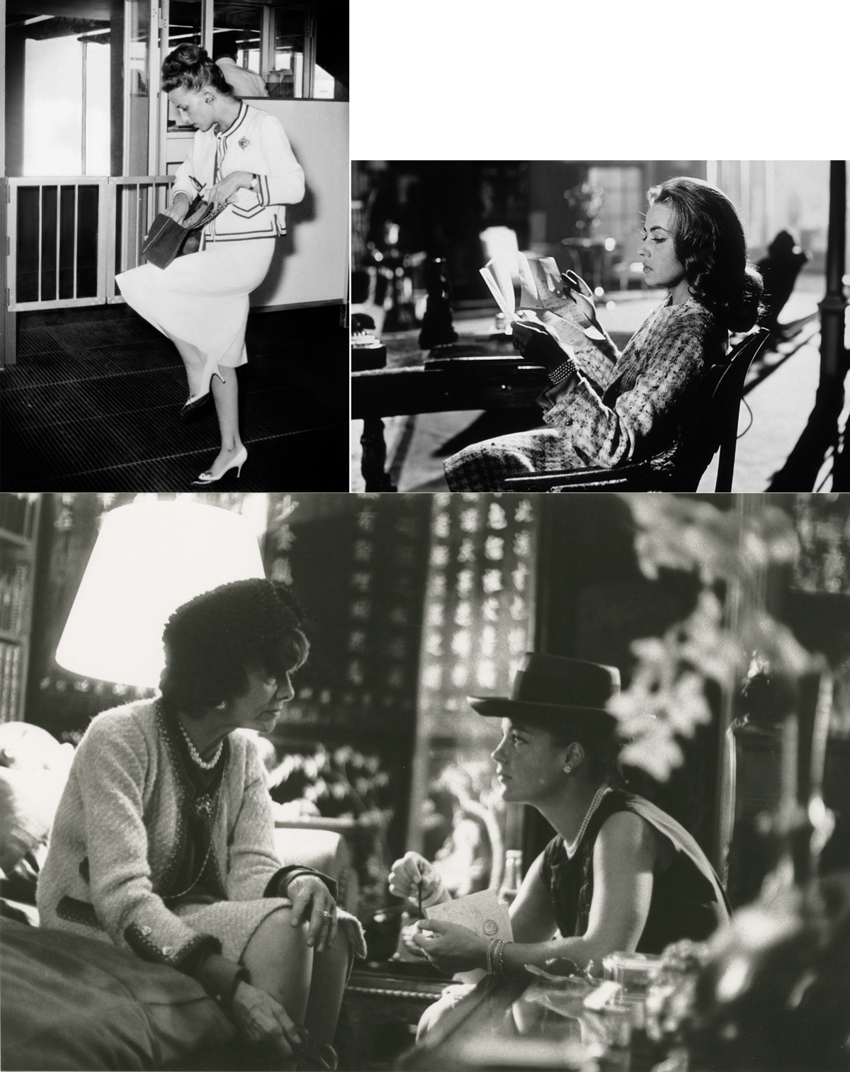 左上:ジャンヌ・モローがシャネルのスーツとバッグを携えローマの空港にて。(1961年)© Keystone France 中:映画『危険な関係』より、仏俳優ジャンヌ・モロー。(1960年)© Getty Images 下:ロミー・シュナイダーとガブリエル・シャネル。(1962年)© Shahrokh Hatami