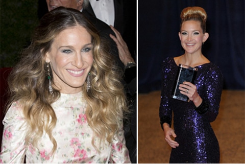 (左)ニューヨークのメトロポリタン美術館で開催された「Schiaparelli and Prada: Impossible Conversations」展の記念ガラパーティに出席した女優のサラ・ジェシカ・パーカー(2012年5月7日撮影)。(c)PRPhotos.com/Janet Mayer(右)ワシントン州のワシントン・ヒルトン・ホテルで開催された「2012年ホワイト・ハウス特派員協会ディナー・パーティ」に出席した女優のケイト・ハドソン(2012年4月28日撮影)。(c)PRPhotos.com/Aaron J. Thornton