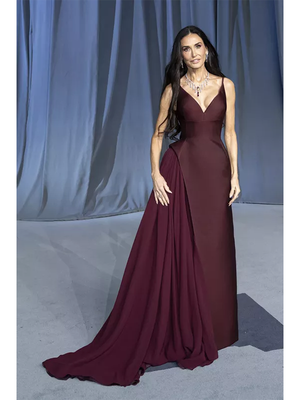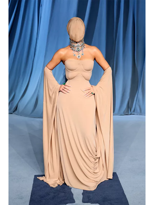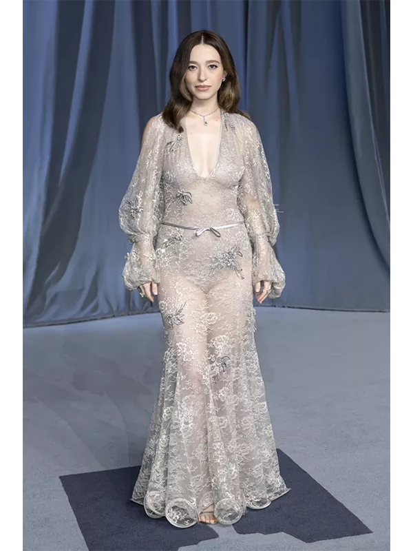 この特別な夜のために、多くのセレブたちが華やかなガラ衣装で注目を集めた。その中でも、キム・カーダシアンはヌードカラーのロングドレスに同色のヘッドカバー、そして特大のダイヤモンドのネックレスを身につけて登場。ジェナ・オルテガは、ブラウンのサテンスカートに、葉っぱの形をしたメタリックなトップスを合わせた装いを披露した。ジェレミー・ストロングはいつものようにカラフルなファッションで、赤いスーツにサングラスを合わせたスタイルで現れた。デミ・ムーアは、深いVネックとアシンメトリーなスカートが特徴的な、美しいボルドーカラーのドレスを着用。カイア・ガーバーは、まるで花嫁のように、レースの白いドレスにトレーンのようなケープを合わせていた。