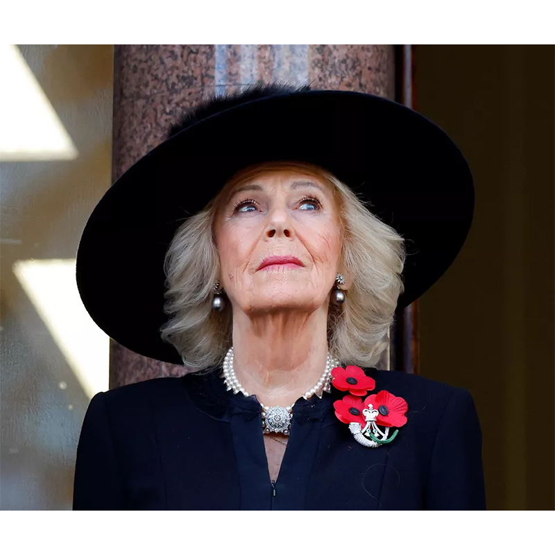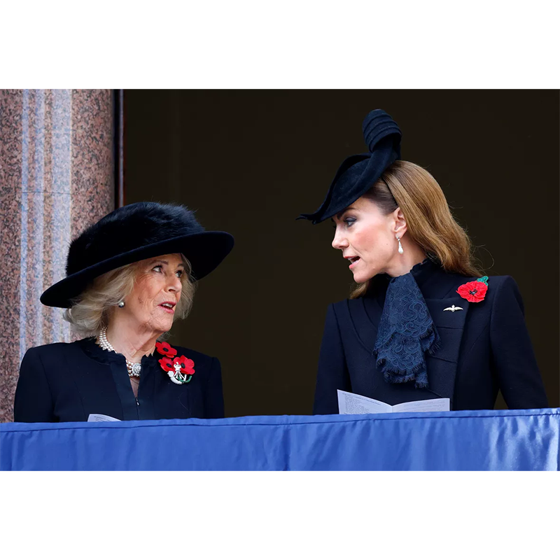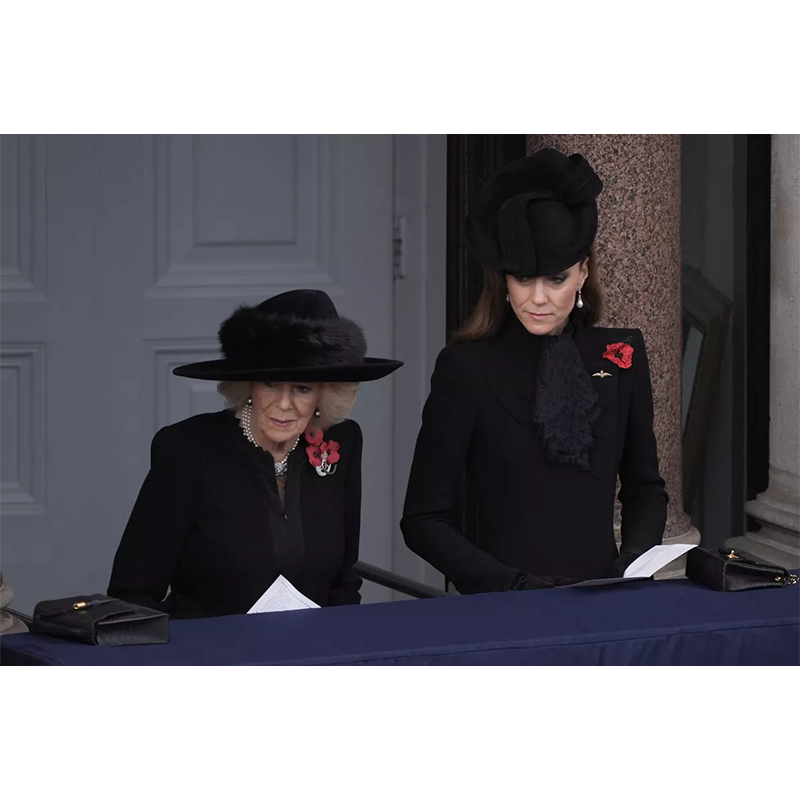記念碑横に建つ外務・英連邦・開発省のバルコニーではキャサリン皇太子妃とカミラ王妃が式典を見守っていた。この日、キャサリン皇太子妃が着用していたのは、お気に入りのデザイナー、キャサリン・ウォーカーによる黒コートだ。2022年の同じ式典で着ていたものだが、今回はレースのハイネックと、Lock & Co.製のエレガントな帽子を合わせていた。カミラ王妃も黒コート姿で、こちらは肩が構築的なデザイン。ファーのついた広つば帽子を合わせていた。