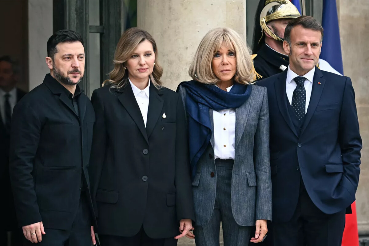 2人のファーストレディはこの日、共にダークカラーのパンツスーツで登場した。12月1日、ブリジット・マクロンとエマニュエル・マクロンは、ウクライナの「和平案」について話し合うため、ヴォロディミル・ゼレンスキー大統領夫妻を大統領官邸のエリゼ宮に迎えた。フランスのファーストレディは、エリゼ宮の中庭でウクライナのファーストレディに出会うと笑顔で抱きしめた。