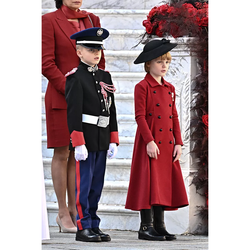 それ以来、モナコの建国記念日は毎年、プリンセスにとってファッションイベントのようだ。昨年は、まるで現代のシンデレラのように、花の刺繍が施された1960年代風のベビーブルーのドレスにシニヨンヘアを合わせて登場した。そして2025年の建国記念日では、深紅のボタン付きコートドレスに、マキシサイズのリボンをあしらったカチューシャをセレクト。この装いは、もうひとりの小さなプリンセス、イギリスのシャーロット王女を彷彿とさせる。キャサリン皇太子妃とウィリアム皇太子の娘であるシャーロット王女は、2022年のクリスマスミサに出席した際、赤いロングコートに髪をすっきりとまとめた姿を披露している。