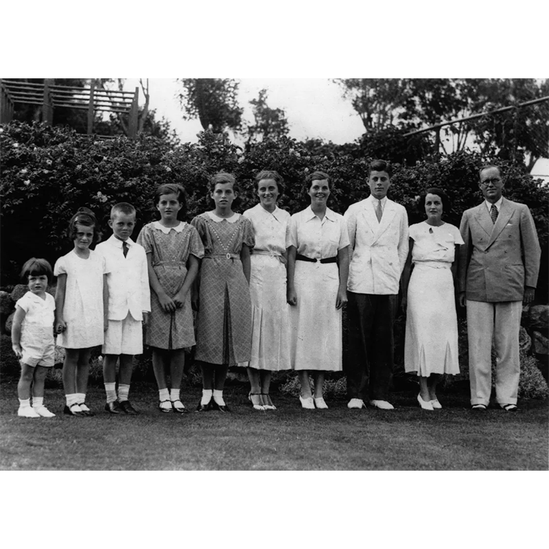 左から、テッド、ジーン、ロバート、パトリシア、ユーニス、キャスリーン、ローズマリー、ジョン・F・ケネディ、母ローズ、そして家長ジョセフ。ロンドン、1937年。