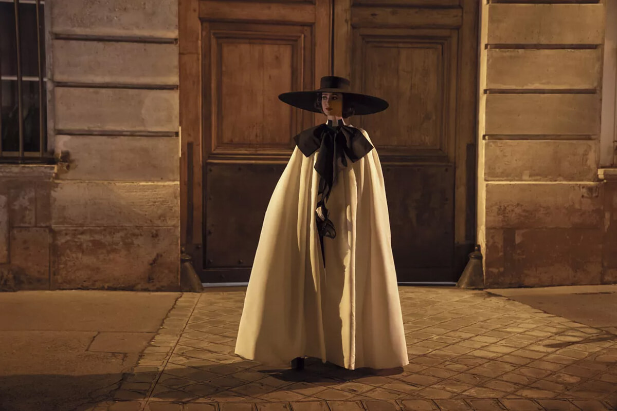 続くシーズンでは、ひときわ注目を集めたファッションがある。サントロペに到着するシーンで披露したのは、パステルカラーのストライプ柄ミニドレスに、レトロなモチーフのコートを重ねたスタイリングだ。アクセサリーには、ドレスの色合いを引き立てるライトブルーのヒール、グレース・ケリーを思わせる巻き方のスカーフ、そして指なしの白いグローブを合わせ、クラシカルなムードを演出する。特に目を引いたのは、印象的なフレームの白いサングラスだ。