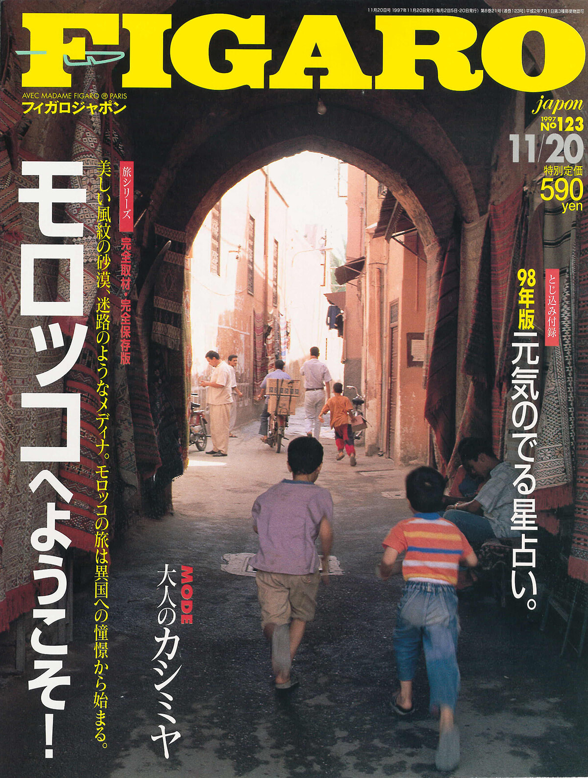 確かそうだ。塚本香氏と一緒にミラノコレの取材出張に行っていた時、原稿書きが終わらないよ~と部屋で、モロッコ取材の原稿を塚本氏が書いていた……。出張に来て、旅取材の原稿を書くなんて本当につらいな、と横目で眺めていた筆者。モロッコはまだ女性だけで旅することが困難な国で、特集の最後に注意書きなどを細かく入れていた。それでもスタートページのマラケシュで「ミステリアスな旅の始まりは、夕焼け色のメディナに迷い込んで」というタイトルのロマンティックな感じを読むと、異文化の刺激が伝わってくる。フィガロジャポンは果敢に新しい旅先を当時、探していた。ファッション撮影はフェンディのモードページが映画的で素敵。ヘアメイクを亡き加茂克也氏が担当していて、懐かしさを覚える。そして、実は元気が出ない「元気の出る星占い」特集。星々は98年に対して甘い言葉を語ってくれていなかった。また、最高にダジャレ風だったのが、来日したマリオ・テスティーノ密着ドキュメントで、スーパ写真家の写真家の横にルビで「マリオ」とふられていたこと。笑える。
