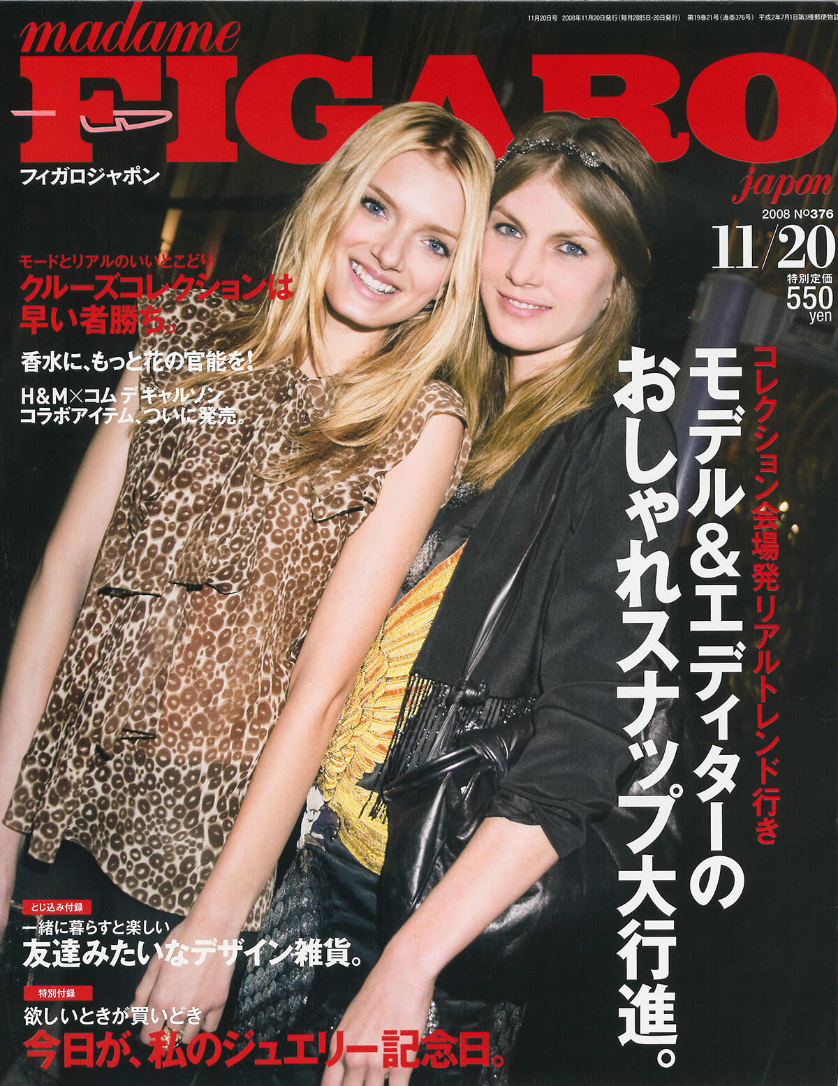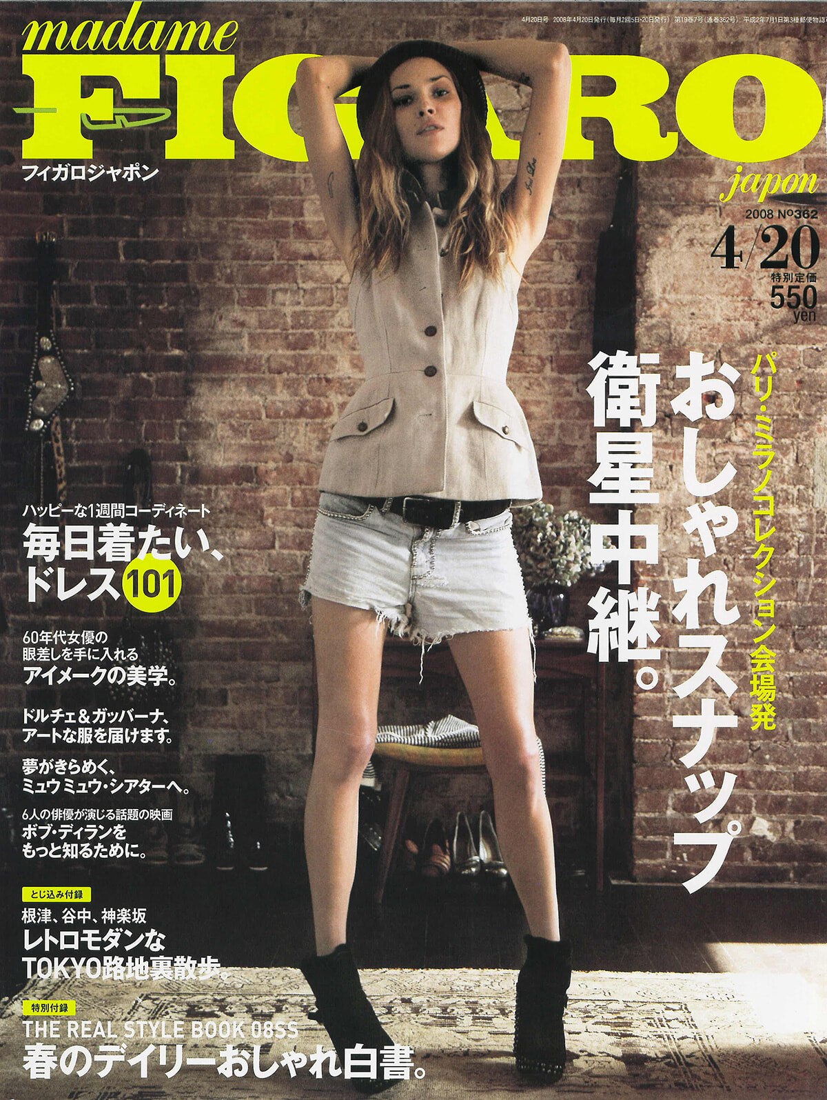 何度か起用している、レディモードのおしゃれ。白い肌にアイラインをしっかりと、ビジューはホワイトストーンで。黒を上品に纏う。そんなコードが、この季節のトレンドをつくっていた。そして2008年6月1日、ムッシュ イヴ・サンローランが逝去。巻頭モードストーリーより前の面付で、追悼の記事は掲載された。こういうことこそ、媒体のアティチュードだと思う。カルチャーテーマでは、ミシェル・ゴンドリー、レオス・カラックス、ポン・ジュノによるオムニバス映画『TOKYO !』のレポート。筆者はポン・ジュノの撮影現場を訪れ、「アクション!」の声の大きさに驚いた。カラックスの現場にも行き、外でひとりで箱弁を食べているカラックスの姿を見て切なくなった感慨を憶えている。あ、シューズ&バッグ別冊、前回は300アイテムくらいの紹介だったのに、555に戻っている……。