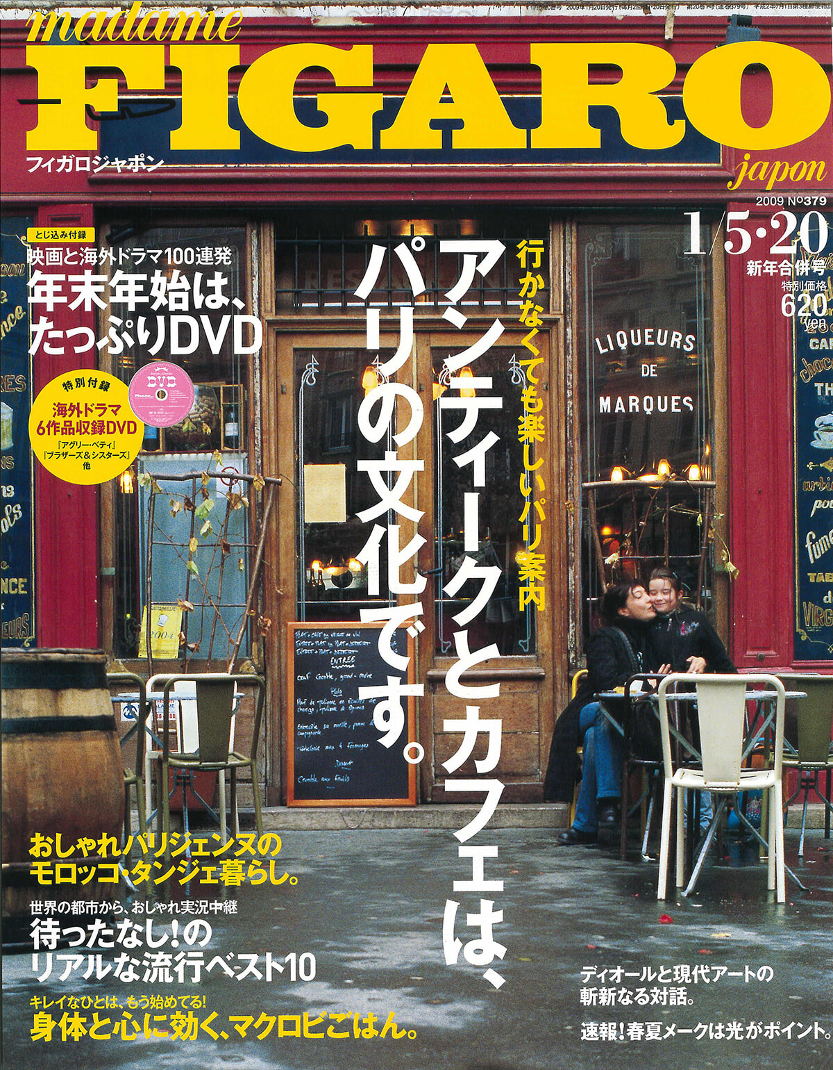 行かなくても楽しいパリ案内、って素敵だ。アンティークブティックとカフェ。確かにパリにはたくさんある風景。レースも銀器も絵皿も、コスチュームジュエリーも、パリのブティックで見ると本当に欲しくなってしまうのだ。オークションにも旅人も参加できる。ドゥルオーで競り落としたら、一生の思い出になるはず。カフェ部門では、ギャルソンの仕事を紹介。有名カフェのギャルソンはフランスの誇り高い職業だ。年末年始はDVD、という配信時代のいまでは考えられない企画が掲載されている。でも、うれしいのは人気ドラマ6作が入ったDVDが付録でアタッチされていること! また、ビュリーの創業者として名高いヴィクトワール&ラムダンのモロッコ・タンジェ暮らしのルポ取材も。このカップルの感性は人々を惹きつけて止まない。