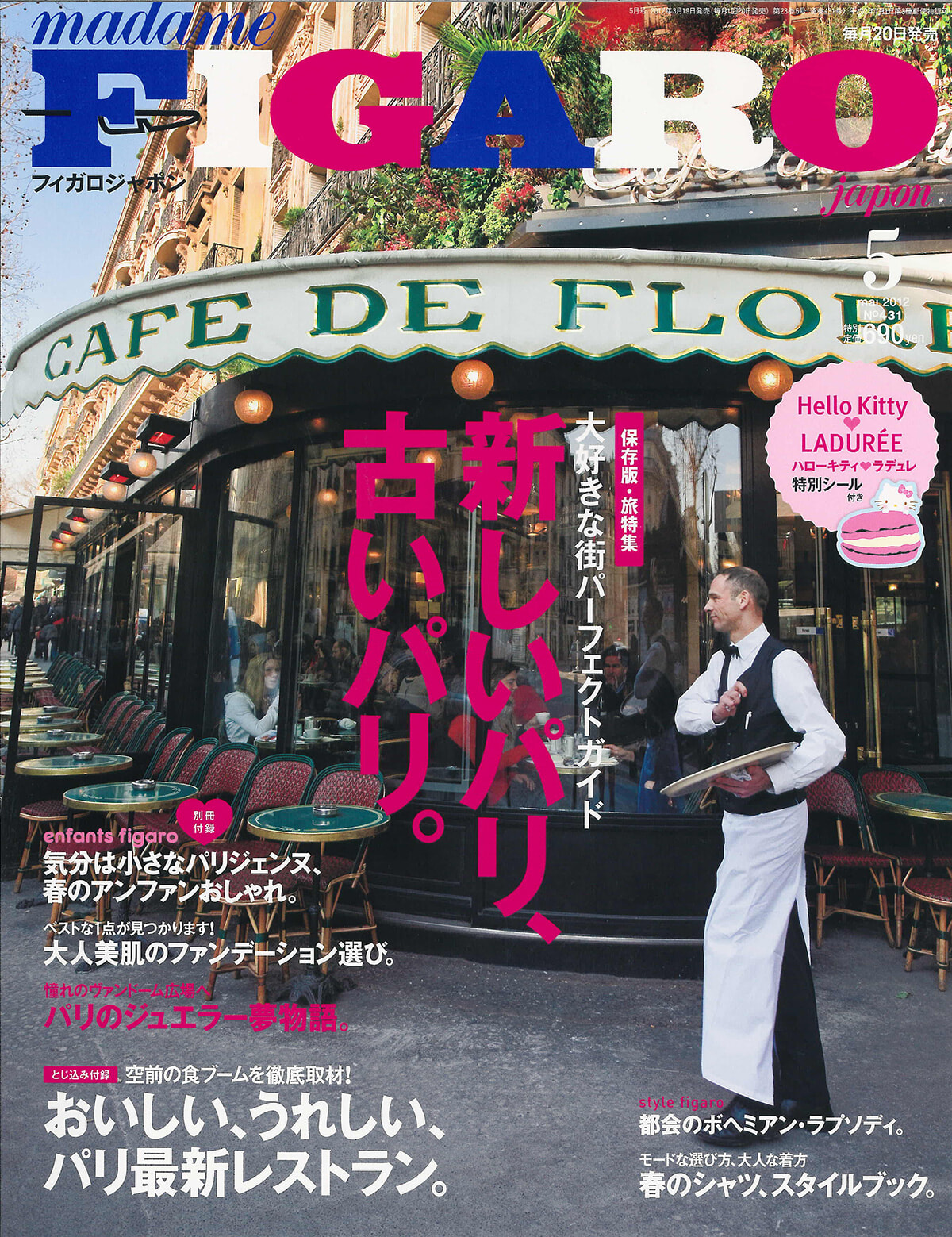 ここまで王道の場所を表紙にしたのはフィガロジャポンの歴史で初。カフェ・ドゥ・フロールが表紙である。新しいパリ古いパリ、そういう特集テーマになったのは、毎年「最新」と言われ最新にフォーカスするが読者は古き良きパリも愛している。そういう場所の知られざるエピソードも紹介したい気持ちから。ウディ・アレンの新作で迷い込んだ場所や、アール・ヌーヴォーやアール・デコの名建築案内、フロールとドゥ・マゴの2トップカフェ物語など、歴史ある場所にはストーリーが豊富だ。カーヴ・ア・ヴァンというワインを楽しむグルメスポットができ始めている時期でもあった。またラデュレとハローキティのコラボを徹底紹介。着ぐるみキティの中にパリ支局長が入っているのではないか?とまことしやかに言われ、そんなはずないだろう!
