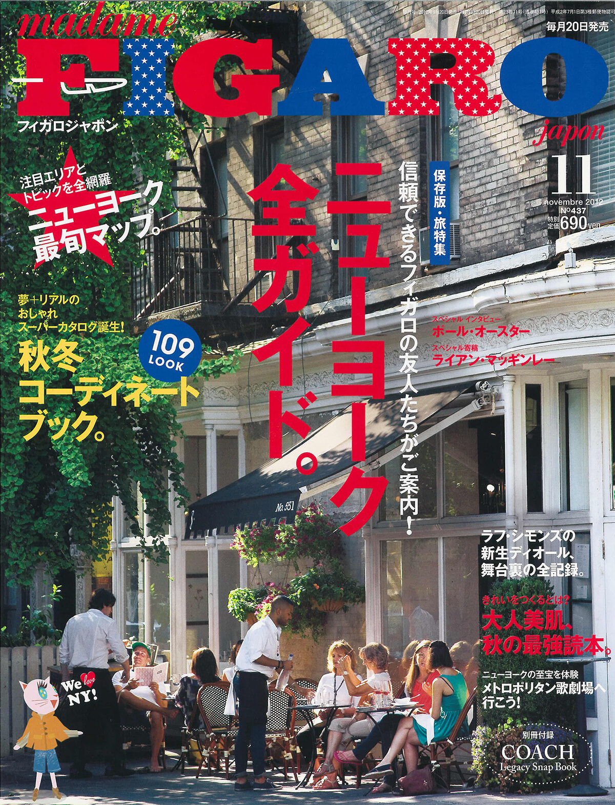 考えてみると大変な旅特集の担当デスクを長年やっていて、「この号は印象が強い」と心に残っているものがある。今号のニューヨーク特集は特に好きだった。ニューヨーカーが推薦するニューヨークは、時にパリを超えておもしろい気がする。変化に富んでいるし、カルチャーはパリ同様あるし。推薦人のなかには、話題のレストランターや、アレキサンダー・ワンもいた。ポール・オースターにインタビューしたり、ライアン・マッギンレーの写真も掲載した。そして矢吹杏子氏(当時は在NY)の描くファッショニスタキャッツもハイブランドのブティックを案内してくれた。キャッツたちは後にmadameFIGARO.jpにて占いコーナーにも登場する人気猫。カルチャー記事に、ラフ・シモンズになったばかりのディオールのルポやメトロポリタン歌劇場の紹介も。スタイリスト提案のコーディネートブック計109ルック、というのも定番化していってゴージャスな出来栄えだった。