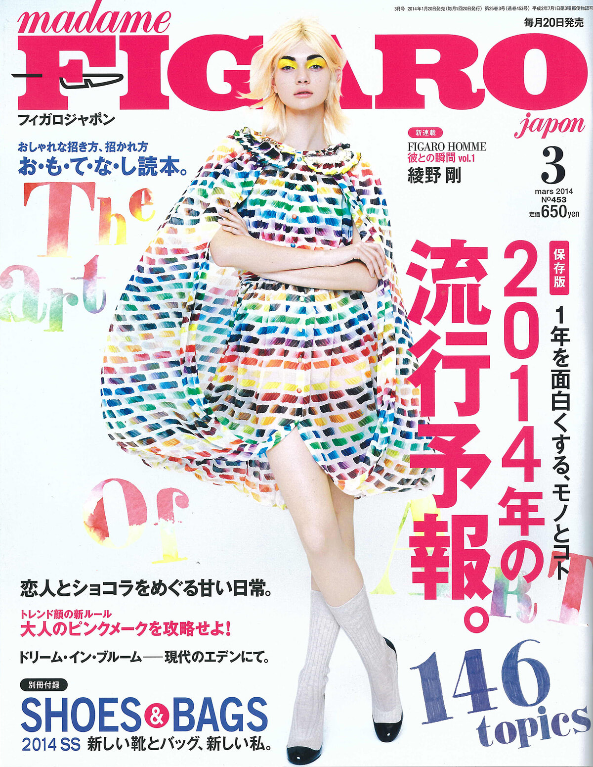 なんだかレイアウトがとても騒がしい号だ。イラストも使い、デザインによる演出も過多にしてしまい、カバーもメイクアップもとても強いものをセレクトした。流行予報は疲れ果てる号ではあるが、今号は特に疲弊していたかもしれない――。フィガロジャポンらしく独特だったのは、「お・も・て・な・し読本」。パリの流儀も加えて作っている。「流儀」や東京オリンピック誘致が決まった時代の「おもてなし」を取り入れて。また、加藤新作カメラマンが撮ったバレンタインショコラページがとっても可愛かった。今号からフィガロオムがスタート。第1回目は綾野剛氏だった。