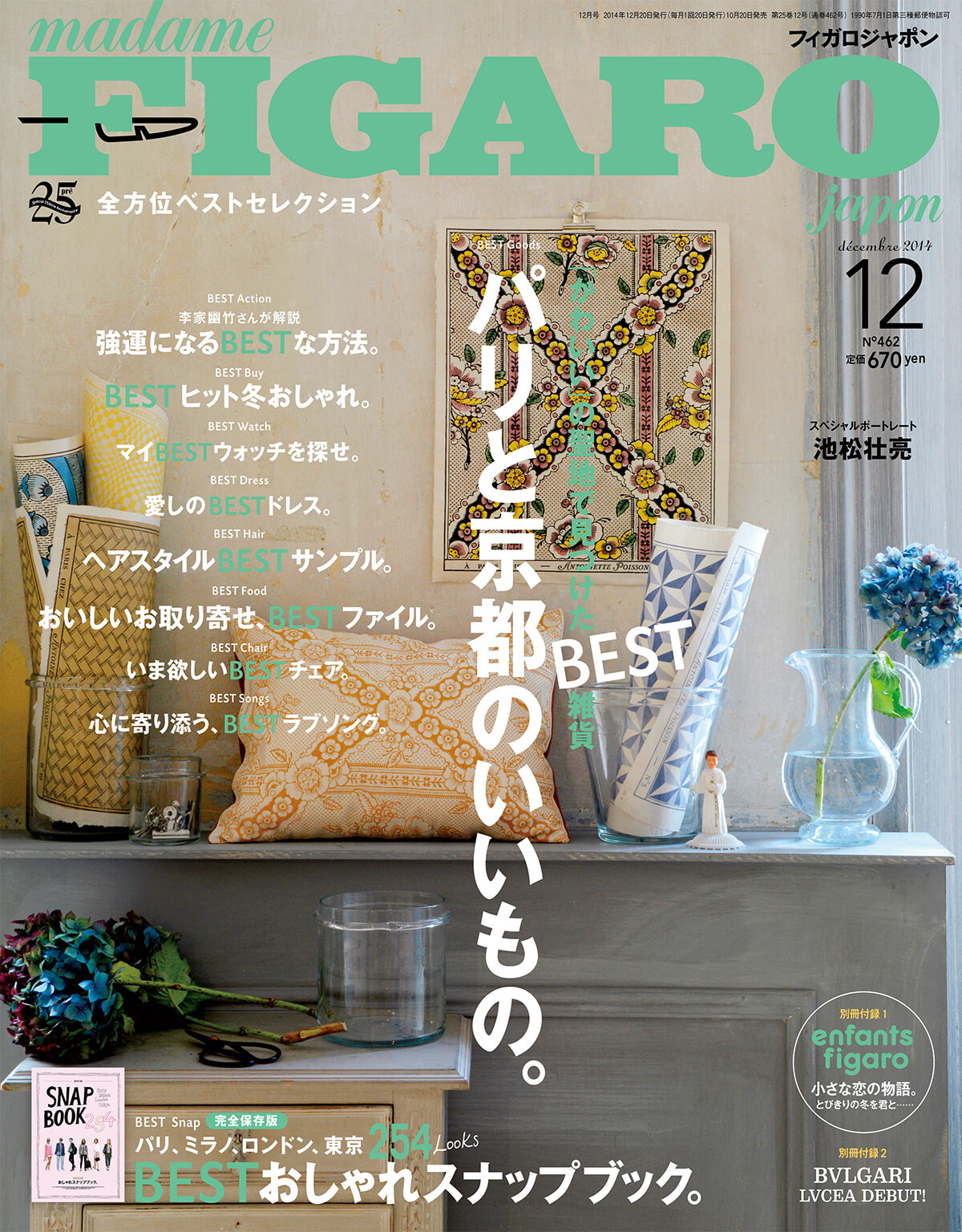 何度かフィガロジャポンで行っている京都とパリの個性比べ。モノに落ちていてとても可愛い。作原文子氏が京都の骨董市にもパリの蚤の市にも足を運んで探したり。見開きでテーマごとにきれいに比較しているのは、骨が折れる編集作業だっただろう。おしゃれスナップまで別冊付録に……! 実は今号もBEST特集ゆえ、スナップにもベストがあったり。そしてヘアスナップまで! そしてベストソングまでやってる。今年生まれた愛の曲から、ということで、筆者も大好きな曲「ひまわりの約束」(秦基博)がランクイン。