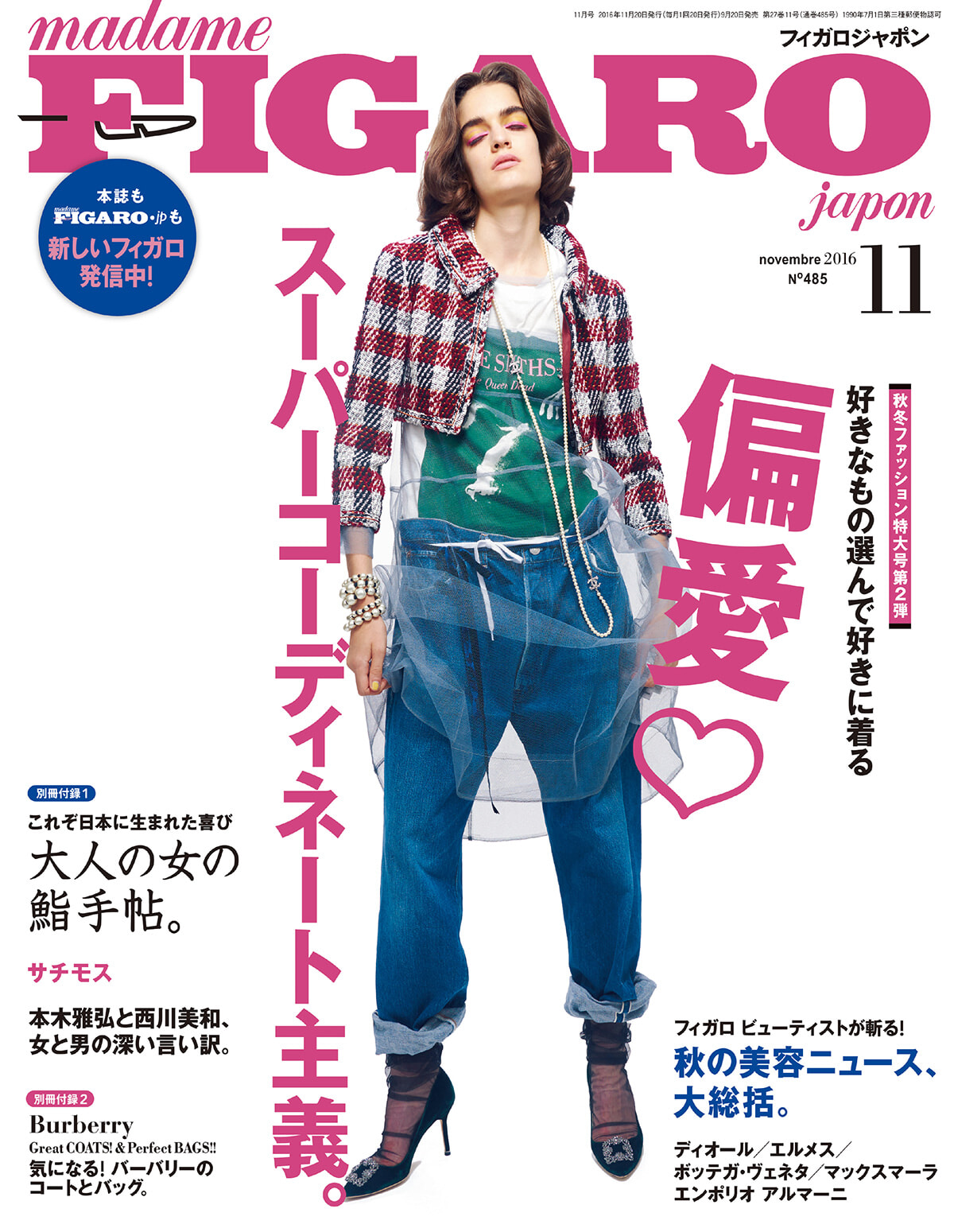 フィガロジャポン編集部でも「トレンドワード」というものがある。上野編集長になってからは「偏愛」がそのひとつになった気がする。サブタイトルの、好きなもの選んで好きに着る、も上野編集長らしい言葉。秋のボリューム美容特集では、美容ジャーナリストの安倍佐和子氏や松本千登世氏に加え、新たにネイリストの渡邉季穂氏、美容ドクターの貴子氏、メイクアップアーティストMICHIRU氏がフィガロビューティストに。評論家目線に加えて、リアルな美容顧客と接する方々の意見が取り入られることとなった。思い出深いのは、映画『永い言い訳』の公開にあわせて、西川美和監督と本木雅弘氏の対談を掲載したこと。西川監督を敬愛しているため、取材日は緊張マックスであった。