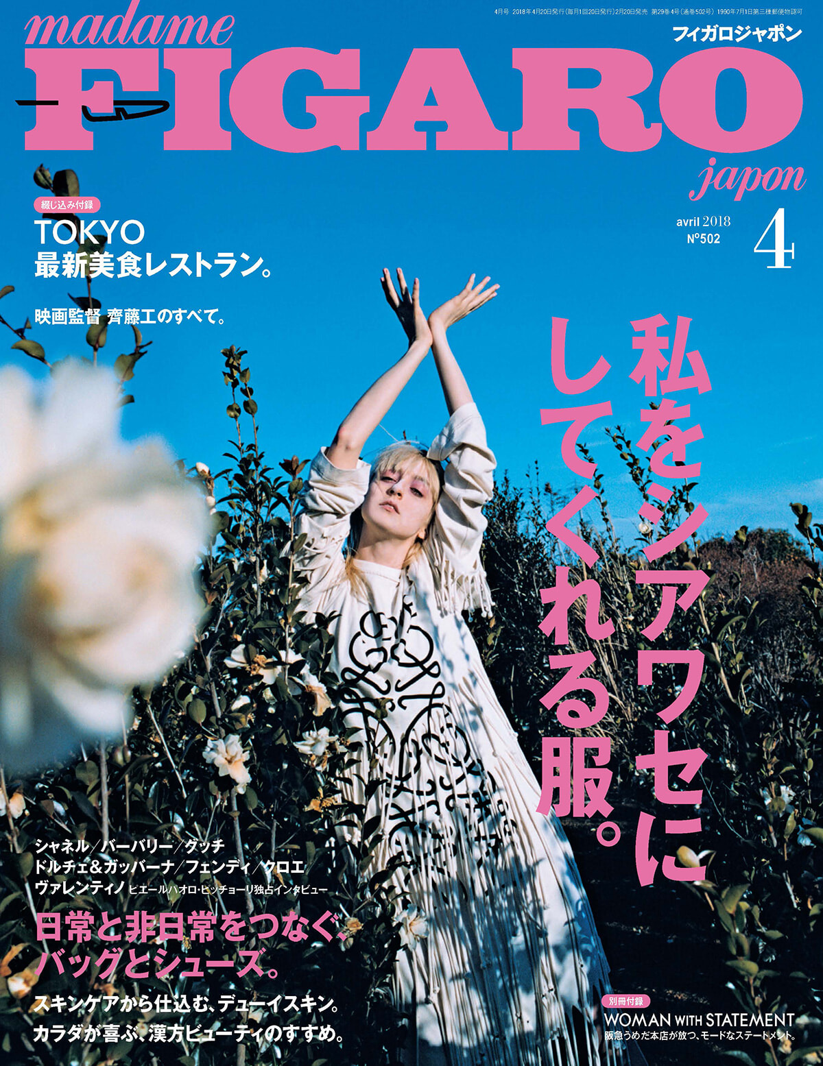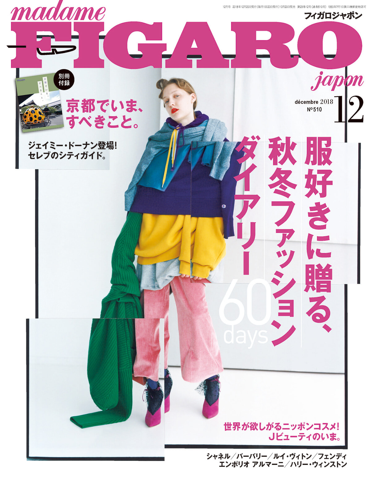 カラーの選びがとてもユニーク。いい意味でモデルの服をマッチしている紫のロゴ。中身はファッションダイアリーだが、コーディネート大企画である。Kコスメの次はJ?とパリの百貨店ボンマルシェでのポップアップの影響を受け、欲しい買いたい新機軸の日本産コスメを特集。いまはもうなくなってしまったが、イトリンなどは本当に贅沢な美しいスキンケアであった。別冊付録で「いま京都ですべきこと」特集を組み、合言葉はアナザー東京にならないこと。東京の進化が他都市にも影響を与えるとローカルな愉しみが少なくなる、と取材チームはがんばっていた。