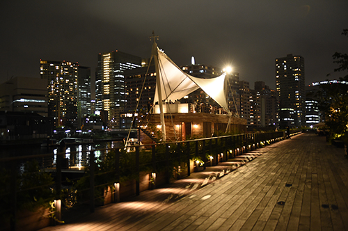 建築に造詣が深いトーマスが選んだ会場は、日本を代表する建築家、隈研吾氏が監修した水上施設「WaterlineⅡ」。白い帆を張った木目の2階建ての施設は自然美と都市美を一体化させたようなデザインで、まるで水辺に浮かぶ大きな船のような佇まい。