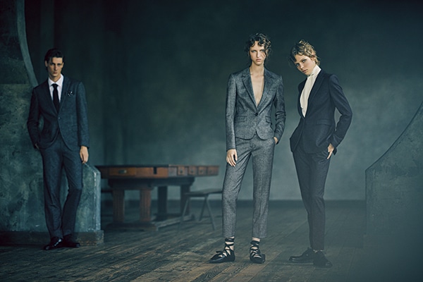 中央:季節ごとにさまざまな素材で展開されるロングセラーパンツ“クイーン”は、さまざまなバランスにマッチすると評判。ジャケットはコンパクトシルエットで軽やかに。レースアップシューズをアクセントに、官能的なエッジを添えたい。