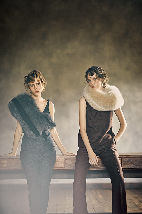 左:モードなワントーンの色合わせで。ななめがけしたボリュームのあるフォックスファーが、粋な遊び心を演出。トップ(参考商品)、パンツ¥49,680、フォックスファーマフラー¥63,720/以上ジョゼフ(オンワード樫山 お客様相談室)