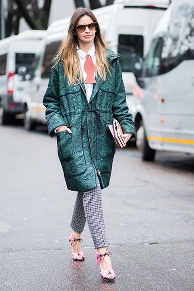 マニッシュスタイルを個性的にアレンジした上級コーディネート。格子柄のカラフルな細身のパンツでトラッドの味付けを。足元はデザインコンシャスなピンクのサンダルでフェミニンに。