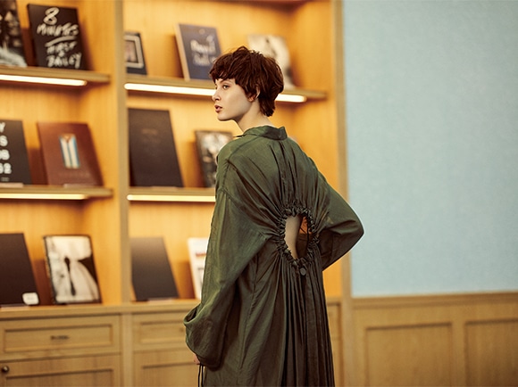 キャッチーなバックスタイルが視線を集める、ミリタリーカラーのシャツドレス。スポーツテイストのドローストリングディテールは女らしいドレープを生み、ジョゼフらしいアンビバレントな魅力を放つ。ほのかに透け感のあるコットンシルクに、これ見よがしでないセクシーさを託して。