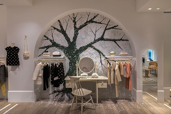 2階クチュールコーナーの壁には、日本人アーティスト田中健太郎さんによる桜の木の絵が。